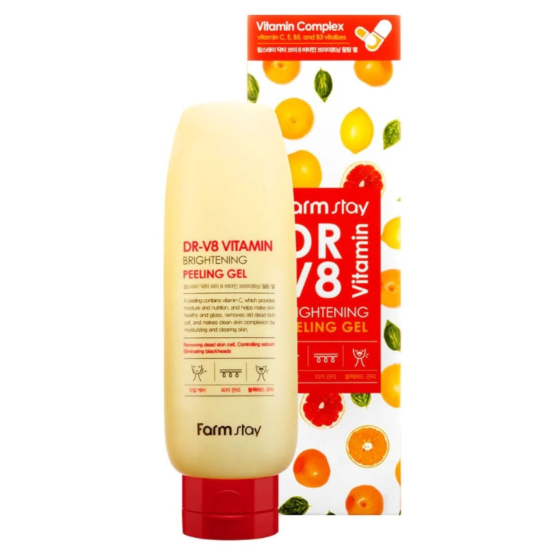 تعزيز اللمعان وتوحيد لون البشرة باستخدام جل التقشير وتفتيح البشرة DR-V8 بفيتامين من Farm Stay