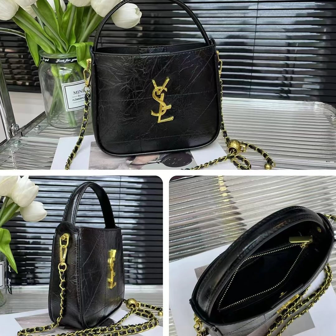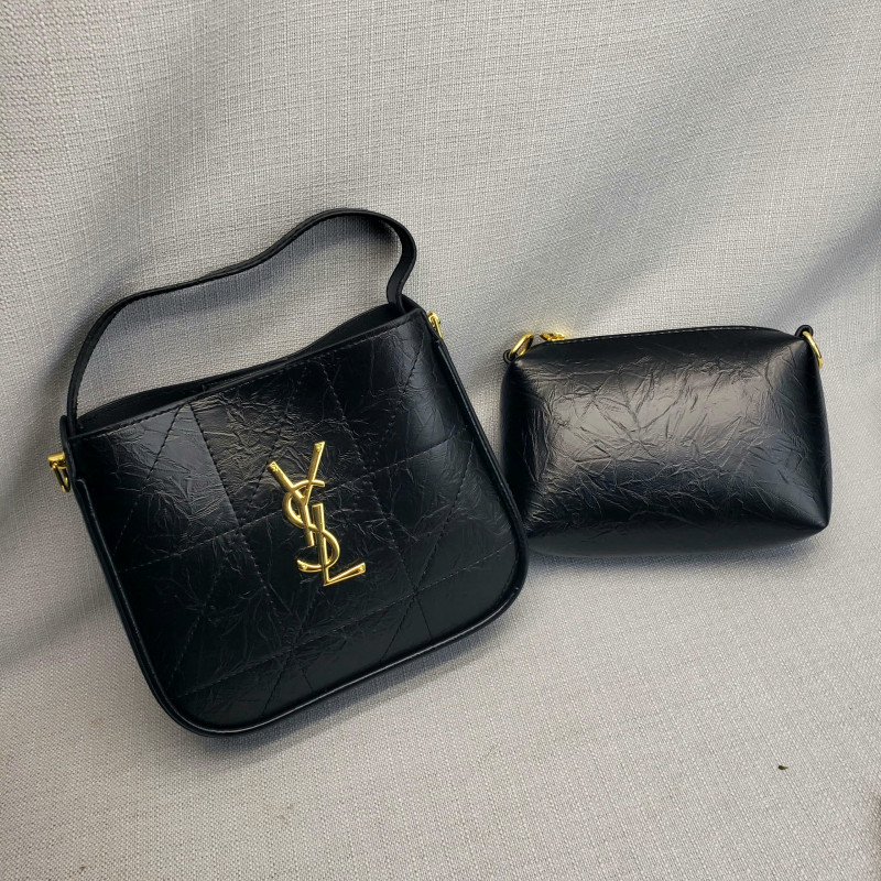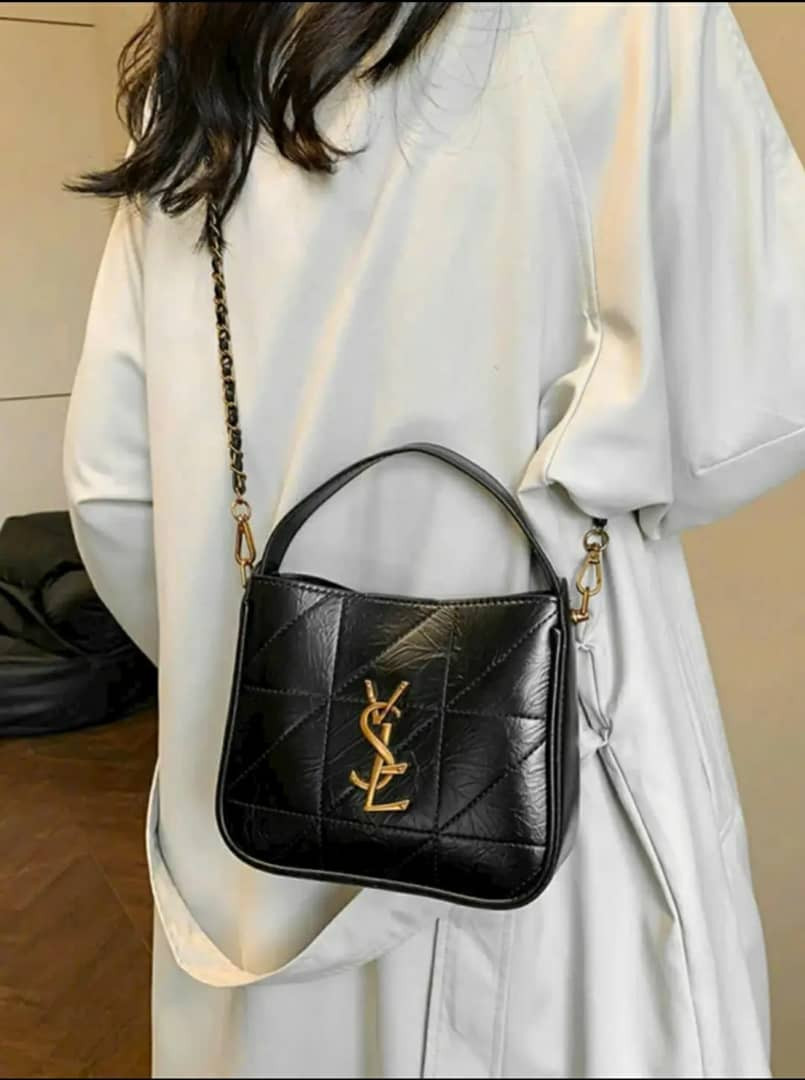 تتميز بحِلية شعار YSL معدنية باللون الذهبي مع حزام سلسلة وجلد قابل للطي لحملها على الكتف.